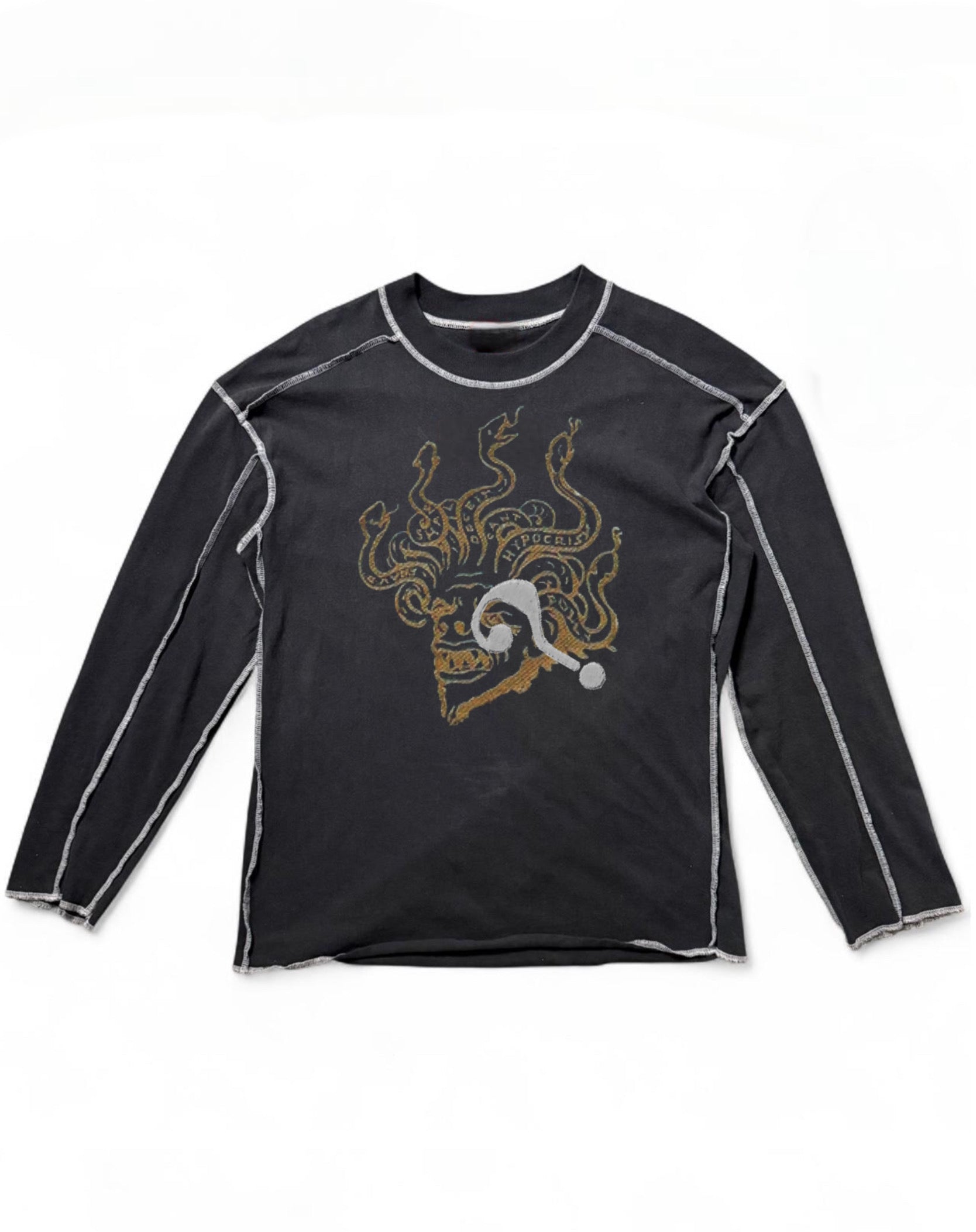 • Distressed hem + cuffs with raw-edge detailing